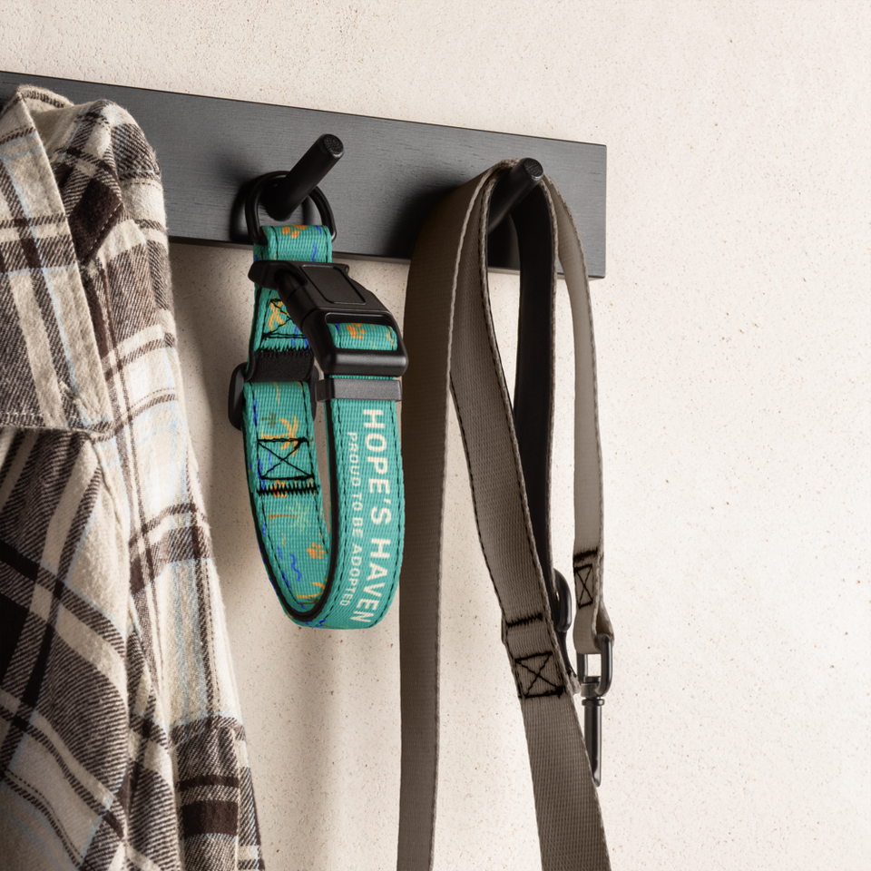 Let your pup wear the mission proudly! This custom-designed collar features tropical island flair and the message “Proud to be adopted” — because second chances deserve to be celebrated.
